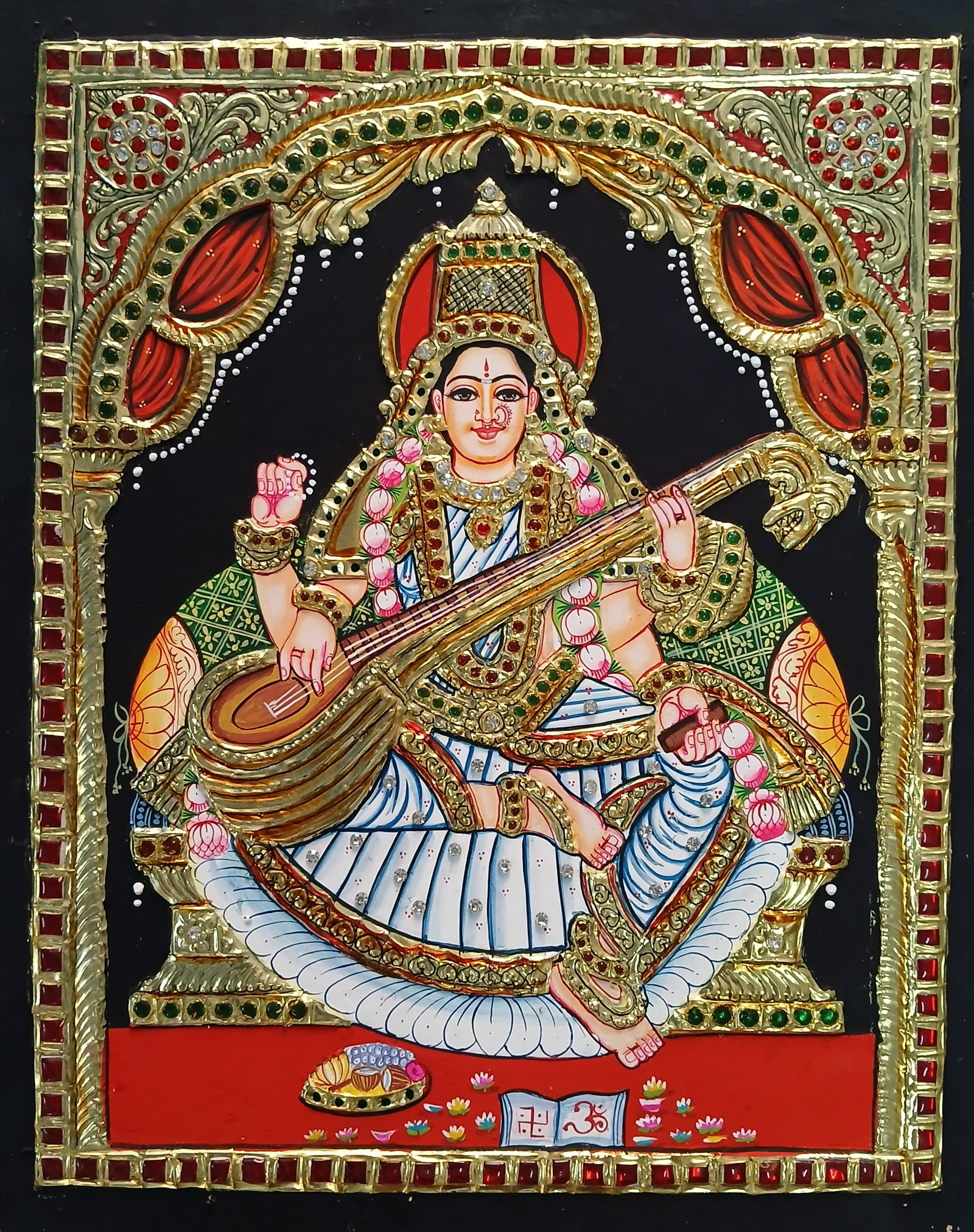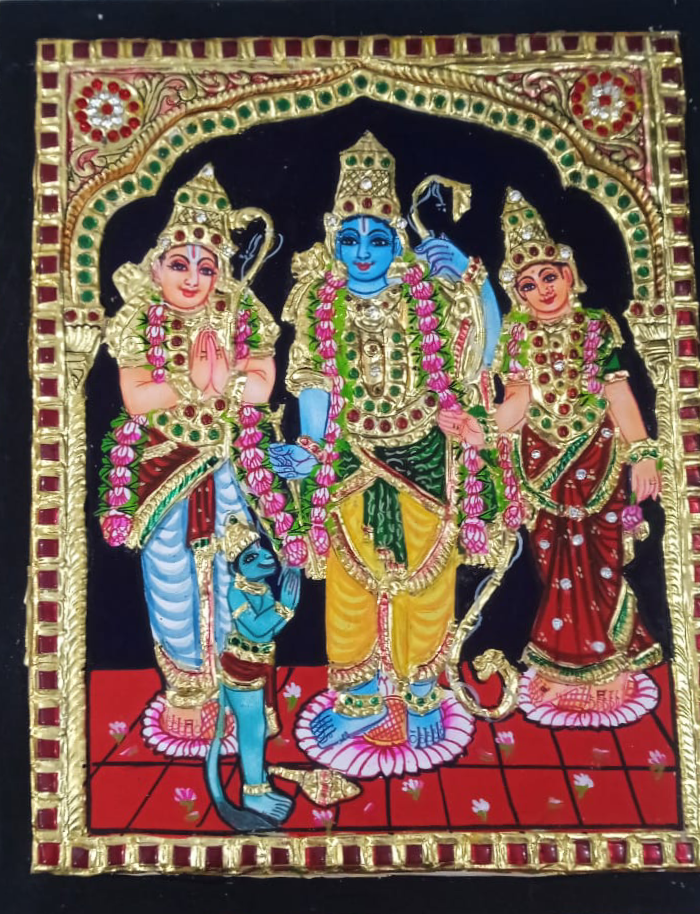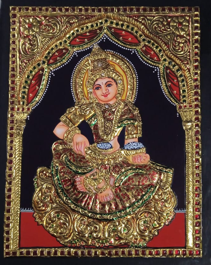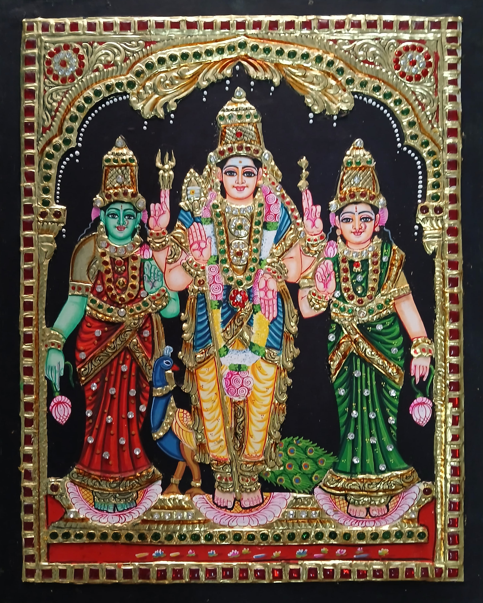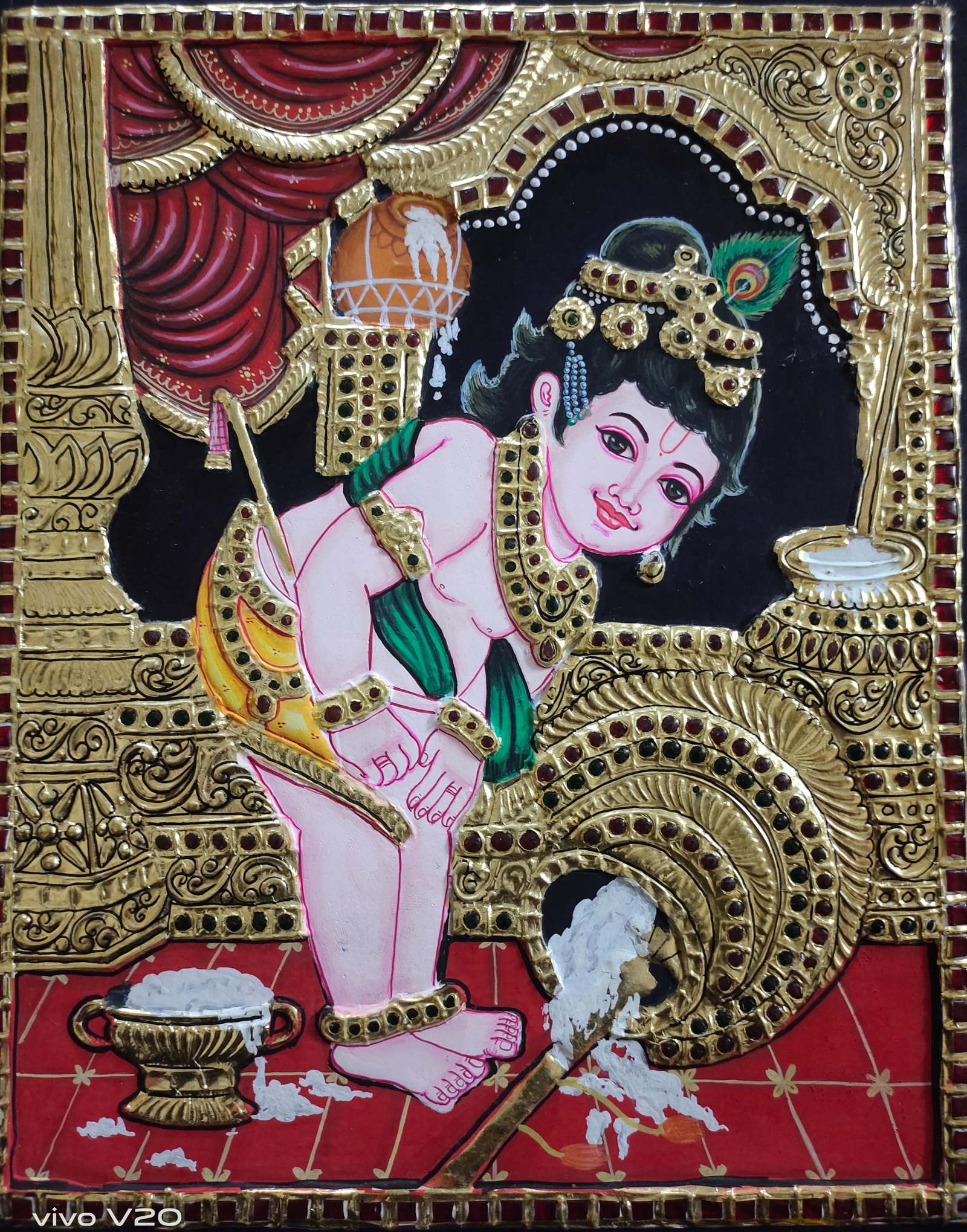 Tanjore painting is a traditional form of Indian painting that started in Thanjavur (also known as Tanjore) in the Indian state of Tamil Nadu. It is notable for its vibrant colours, complex detailing, and use of gold foil. The paintings often portray Hindu gods, goddesses, and saints and are distinguished by a distinct compositional style that places the primary figure in the centre and is flanked by smaller figures or ornamental embellishments.
