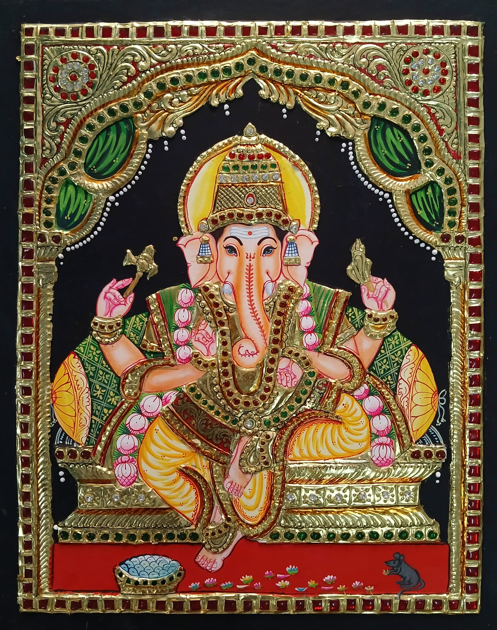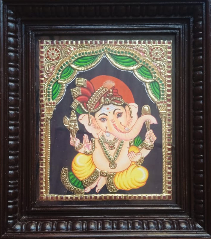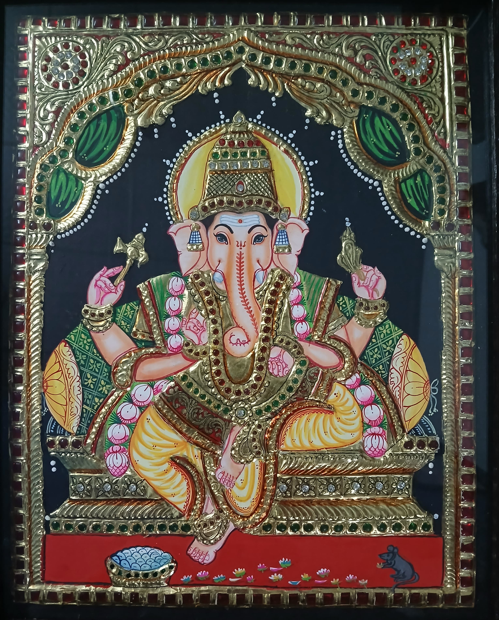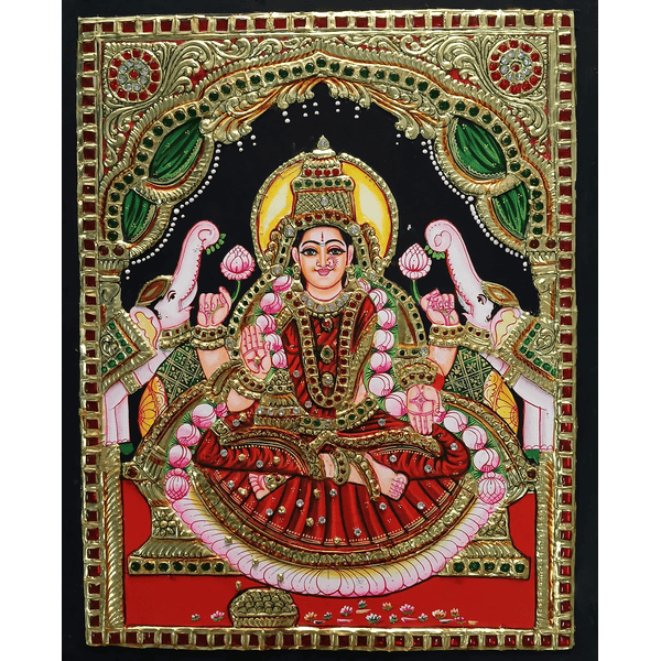 Tanjore painting is a traditional form of Indian painting that started in Thanjavur (also known as Tanjore) in the Indian state of Tamil Nadu. It is notable for its vibrant colours, complex detailing, and use of gold foil. The paintings often portray Hindu gods, goddesses, and saints and are distinguished by a distinct compositional style that places the primary figure in the centre and is flanked by smaller figures or ornamental embellishments.