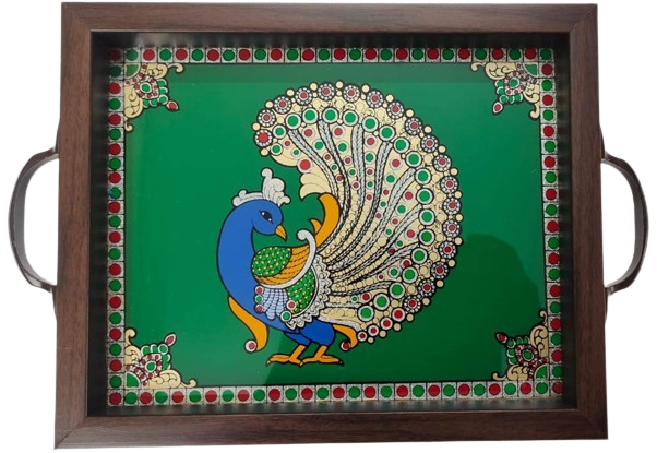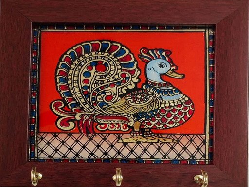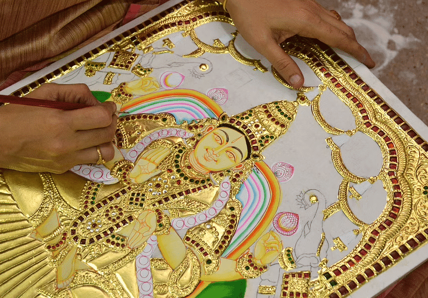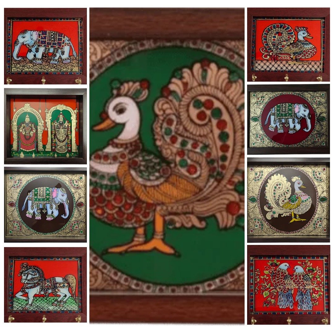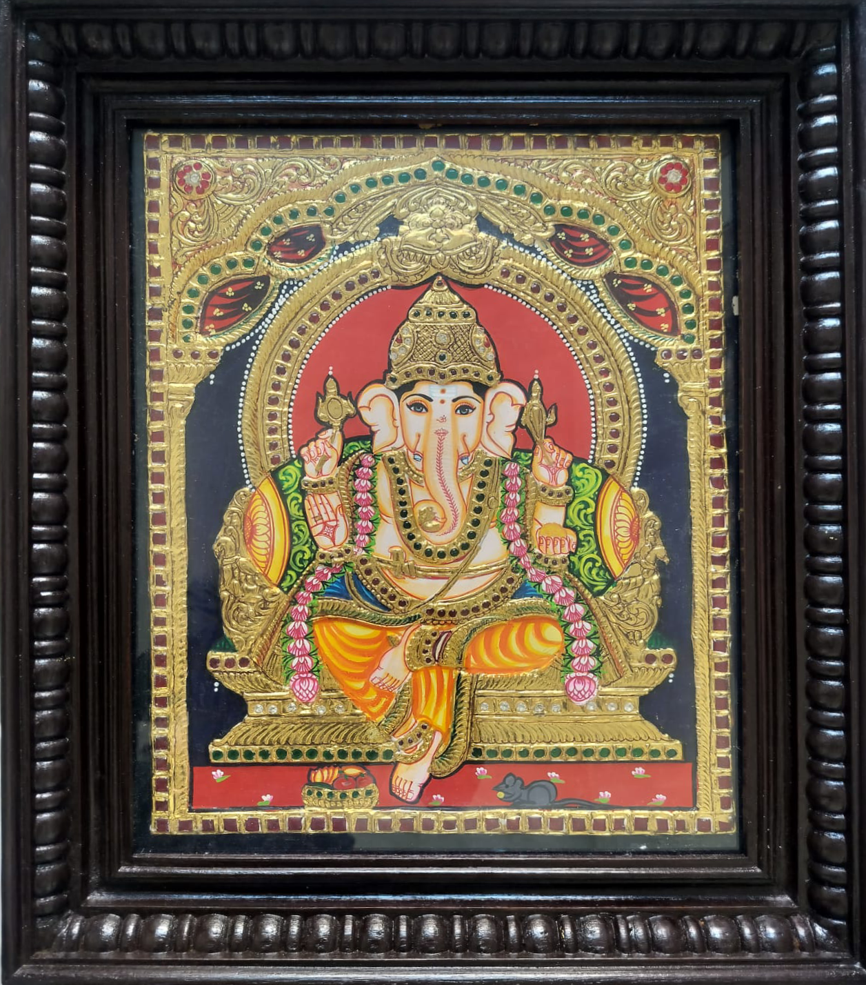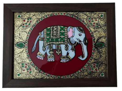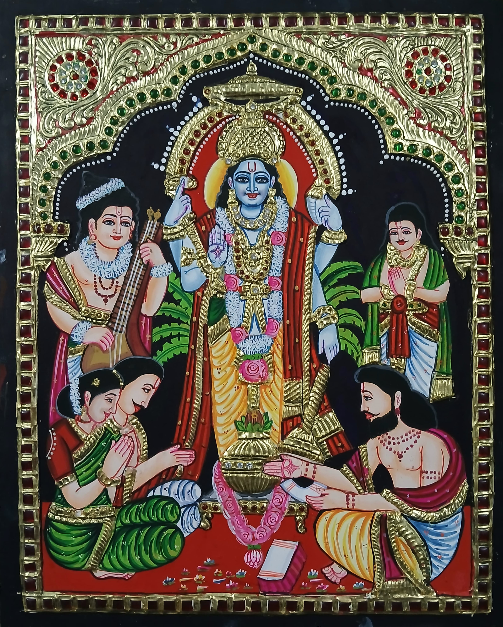 Tanjore painting is a traditional form of Indian painting that started in Thanjavur (also known as Tanjore) in the Indian state of Tamil Nadu. It is notable for its vibrant colours, complex detailing, and use of gold foil. The paintings often portray Hindu gods, goddesses, and saints and are distinguished by a distinct compositional style that places the primary figure in the centre and is flanked by smaller figures or ornamental embellishments.